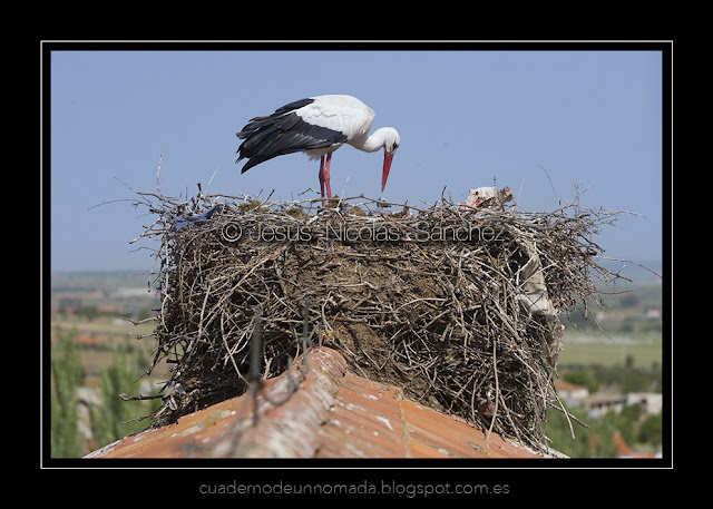 La llegada de los padres a casa provocará, como si de un resorte se tratara, una frenética actividad en los pollos que esperan hambrientos. No es raro que los adultos aprovechen el viaje al nido con el buche lleno de comida para las crías llevando, además, algo más de material con el que tapizar el centro del mismo, manteniendo así su confort e higiene. Con edades como las de los polluelos de esta entrada, los padres hacen acto de presencia principalmente para traerles comida y cebarlos (y para descansar un poco), espaciando paulatinamente su permanencia en el nido a medida que su prole crece, hasta que acaban yendo prácticamente solo a darles de comer. Con edades avanzadas los pollos permanecen mucho tiempo solos en los nidos, esperando. Cuando por fin llega alguno de los adultos los pequeños cigüeños despliegan un comportamiento típico que estimula la regurgitación del alimento por parte de los adultos, adoptando una postura clásica, agachándose y desplegado las alas con unos movimientos similares a un torpe aleteo, y mirando hacia el centro del nido, lo que se aprecia mejor cuando son tres o cuatro los hermanos. Apoyados sobre los tarsos-metatarsos, los pollos esperan que caiga en el centro de la plataforma el alimento que la cigüeña va a regurgitar desde su buche para lanzarse sobre él y engullirlo antes de que lo puedan hacer sus hermanos: la vida en la naturaleza es una constante lucha por sobrevivir. Obviamente también los veremos intentando comer directamente desde el pico del adulto.