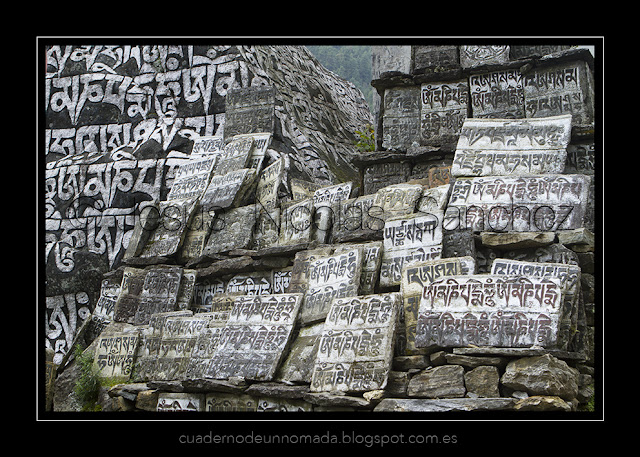 O el hombre y la montaña, porque no sé cual de los dos está más presente en la esencia del Himalaya, si las propias montañas y sus nieves perpetuas, sus alturas y sus rincones inhóspitos e inexplorados, o si sus gentes, con sus creencias y sus dioses, sus quehaceres y su presencia constante. Y es que caminas por valles de dimensiones salvajes y encuentras trazas humanas allí donde mires. Un yakero que evoluciona por lo alto de una ladera imposible tras un yak rebelde que ha decidido asilvestrarse. Los ojos de Buda en un chorten, que observan desde un altozano hacia los cuatro puntos cardinales. Los muros mani que nos anuncian que entramos en una aldea o salimos de otra. Una choza junto a una pradera alpina y sus corrales de piedras mal colocadas que nos recuerdan que alguien pace su ganado en estas minúsculas llanuras alpinas. Los banderines de oración que ondean a los cuatro vientos en hileras de colores escrupulosamente colocados, azul, blanco, rojo, verde y amarillo, proclamando sus mantras tibetanos o sánscritos. Un camino empedrado con infinitos peldaños que suben sin clemencia hasta el cielo o más allá, o que bajan con la misma falta de misericordia a lo más profundo de una garganta cortada de un hachazo en las más grandes de las montañas del planeta, junto a un rugiente río, donde un puente suspendido en el vacío nos permite cruzar a salvo sus aguas blancas y salvajes ... O las voces que resuenan en lo más profundo de un bosque tropical envuelto en nieblas y lluvias suaves, silencioso y misterioso, y que delatan la presencia de algún arriero azuzando a sus acémilas para que, en hileras eternas, no paren de caminar con sus cargas a cuestas.